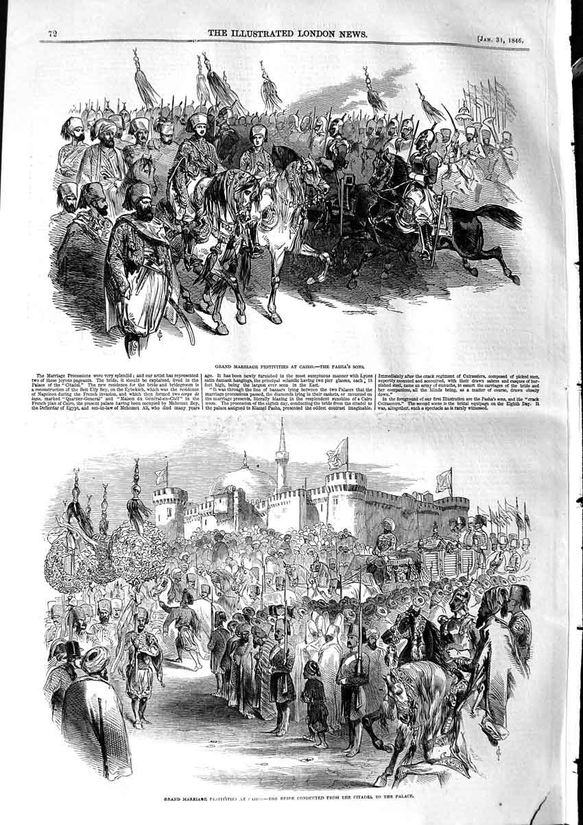 JEUNE MARI?E GRANDE DE FILS DU CAIRE PASHA DE 1846 FESTIVIT?S D'ASSEMBLAGE Full page from our copy of the Illustrated London News dated 1846, an illustrated weekly newspaper weeks date as shown on top of page, the size of each page is approximately 16 x 11 inches (410x280). All are genuine antique prints and not modern copies, the Illustrated London News is an illustrated magazine which was first printed in 1842 and is the finest pictorial example of a historic social record of British and world events up to the present day. The ILN is known for its coverage of the following subjects the wars, ships, boats, guns, sailing, portraits, fine art, old and antique prints, wood cut, wood engravings, early photographs, Victorian life, Victorian culture, kings, queens, royalty, travels, adventures, natural history, birds, fish, mammals, fishing, hunting, shooting, fox hunting, sports including tennis, cricket, football, horse racing, politics and many more items of interest founded by Herbert Ingram may 14th 1842.
